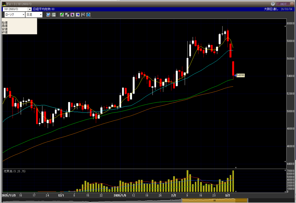 日経先物は3月2日の高値59420円から昨夜の安値53600円まで