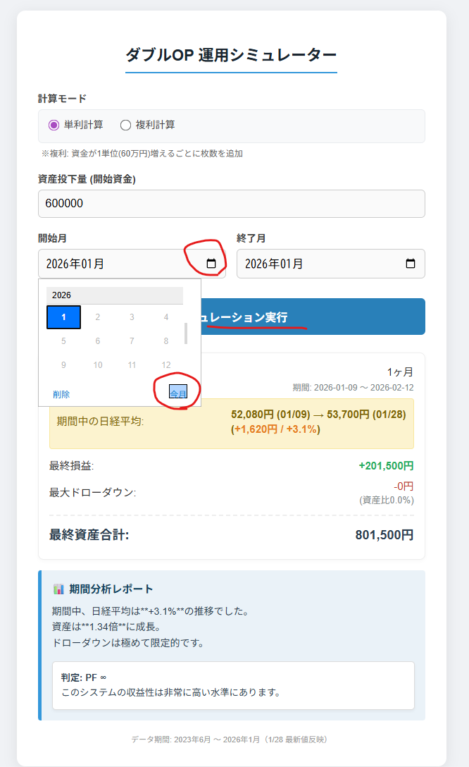 2026年も順調に推移しています。 直近の成績を見るには ダブルOP 運用シミュレーター https://n-kr.skr.jp/ ↑ こちらをクリックし 1.開始月を2026年1月にします。 2.シミュレーション実行を押します。 3.「最終収益」が直近の利益になります。(1セットあたり) プレゼント企画 2025年の成績 ご利用者の声② ご利用者の声① ダブルオプションとは? 忙しい方に最適な手法 複利運用の可能性(シミュレーターあり) 勝ちパターンと負けパターン Q&A ご質問・お問い合わせ 申し込み